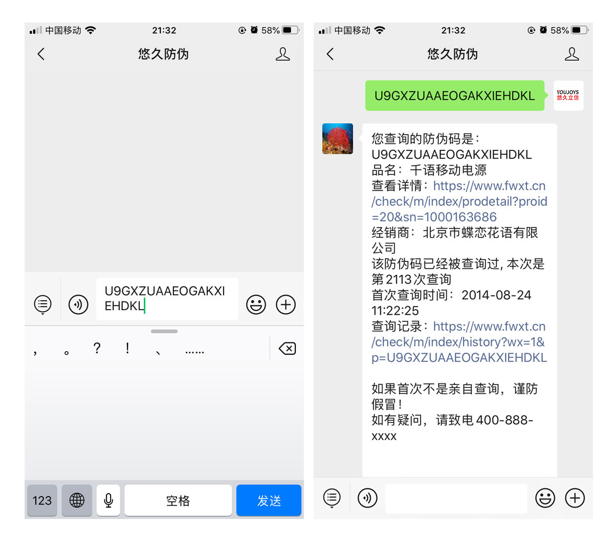 The query interface and QR code query result page can be customized at will. Please scan any anti-counterfeiting QR code below directly to view the effect. Support scanning anti-counterfeiting QR codes on WeChat to receive cash red envelopes.
